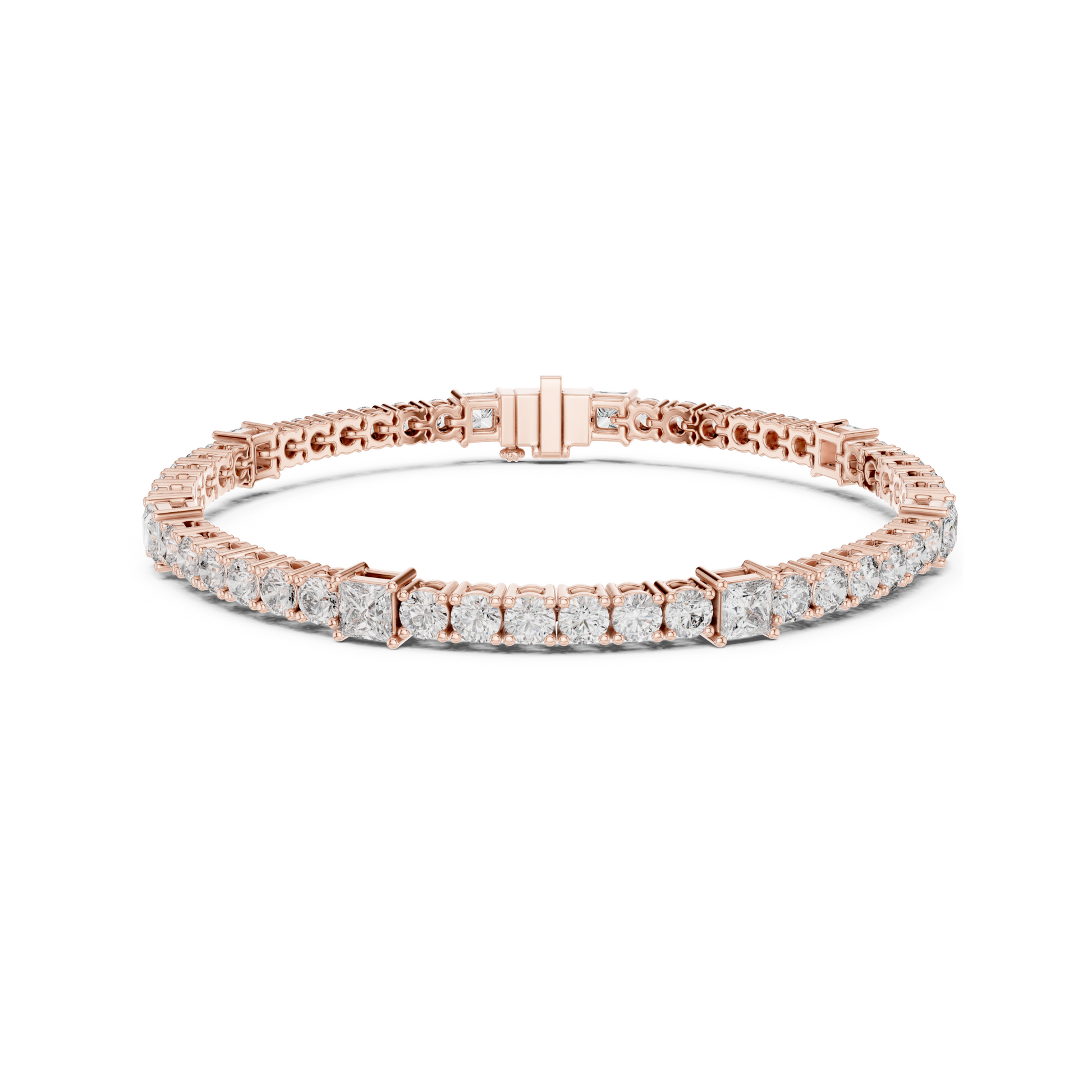 Warm and empowering, this rose gold tennis bracelet shines with 4.62 ct of round lab diamonds and 2 ct of elegant princess-cut accents. The romantic tone, combined with contemporary geometry, makes it the ideal jewelry piece for heartfelt gifts—graduation, birthdays, or just treating yourself to something luxe and meaningful.