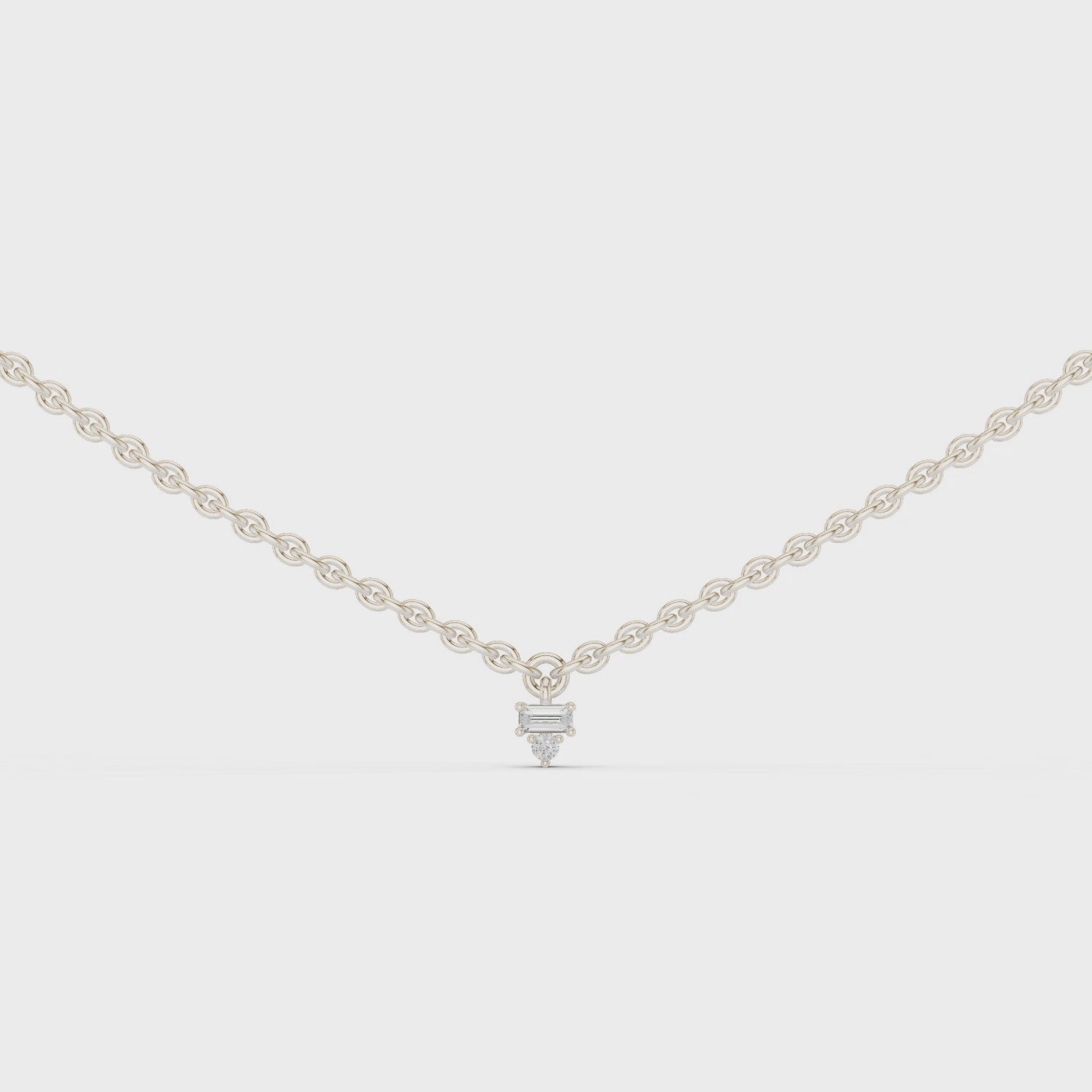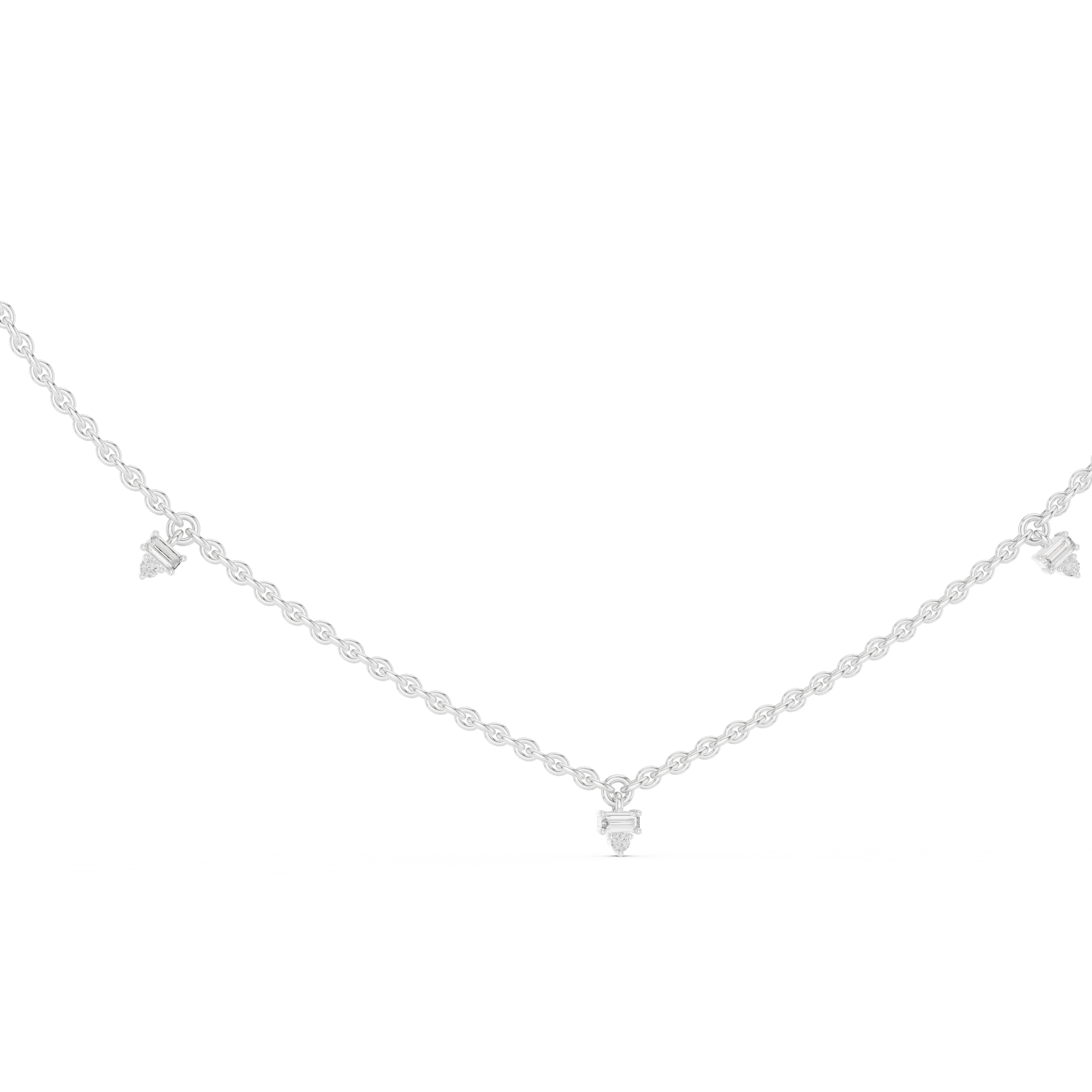 A subtle sparkle for your neckline. This white gold charm necklace highlights 5 round lab diamonds (0.075 ct) and 5 baguette-shaped diamonds (0.23 ct)—set on a sleek, clean-lined chain. The icy tone of the metal amplifies the brilliance, making it ideal for modern, classy teens and women who want refined sparkle.