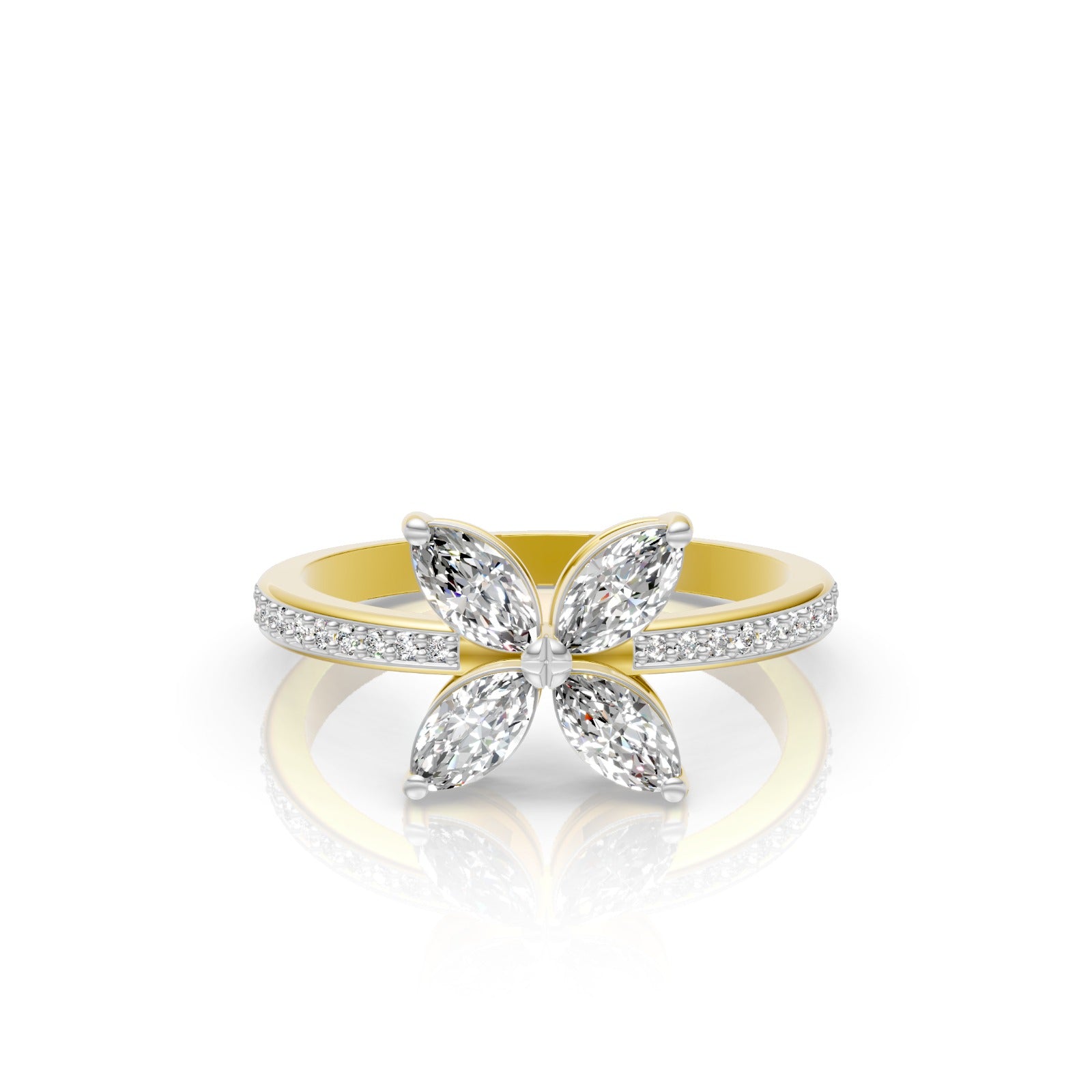 Inspired by graceful floral symmetry, the Eternal Bloom Ring features a striking arrangement of marquise and round lab grown diamonds that come together in a delicate flower motif. The elegant design is enhanced by a refined band accented with shimmering diamonds, creating a perfect balance of brilliance and sophistication.
