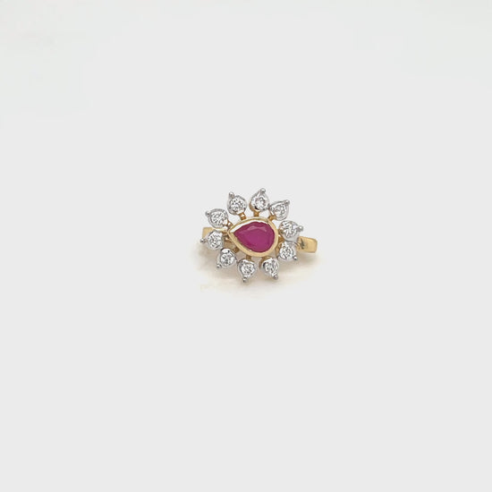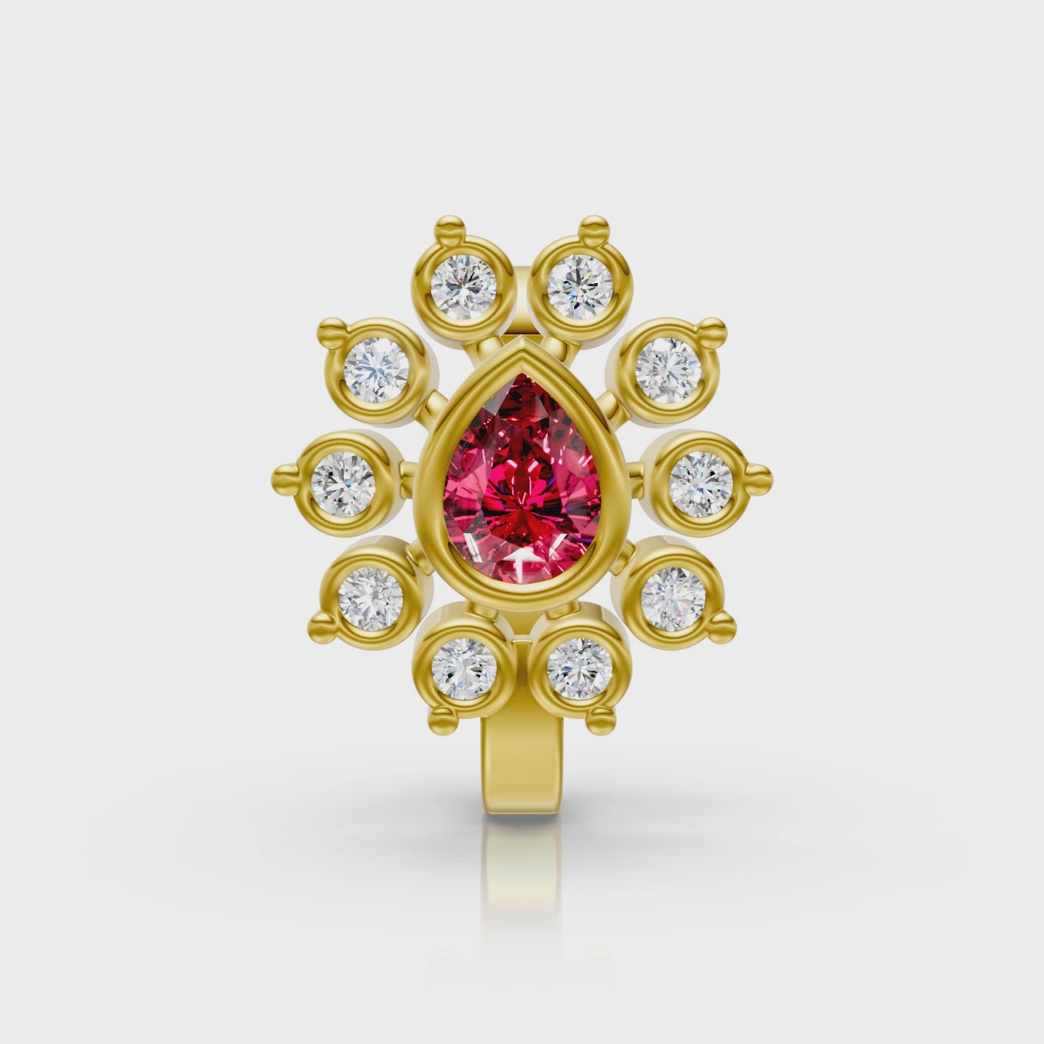 Elevate your traditional look with this beautifully crafted diamond nose pin, designed to blend timeless elegance with refined craftsmanship. At the center, a striking pear-shaped ruby adds a bold pop of color, while a delicate floral halo of sparkling diamonds enhances its brilliance.