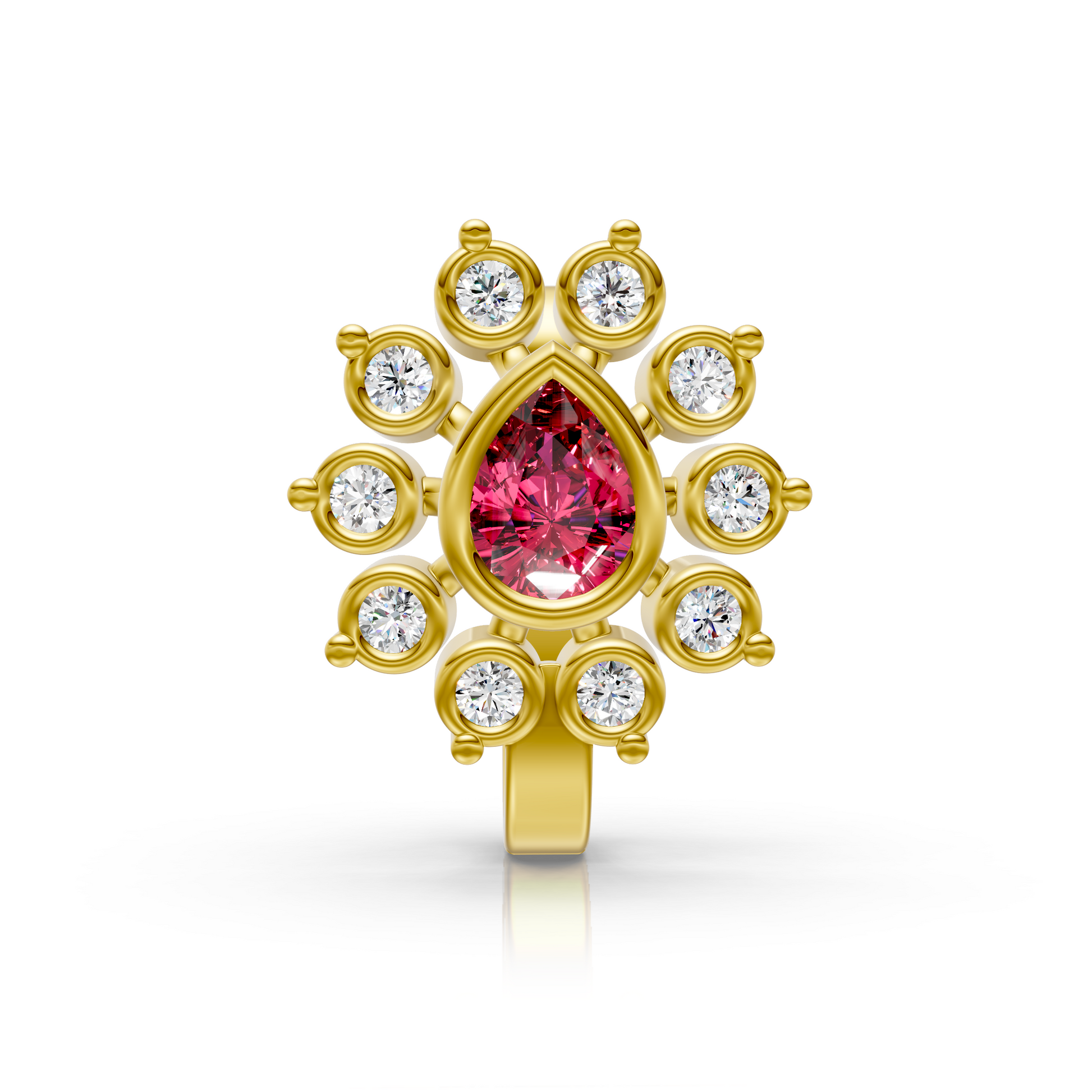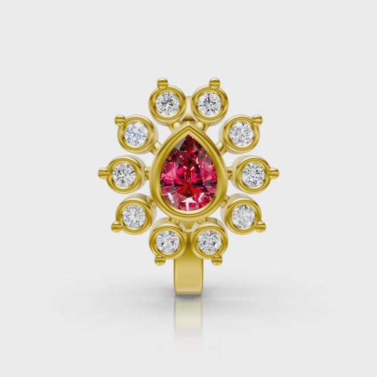 Floral Lab Diamond Nose Pin with Pear-Shaped Ruby in 14K Yellow Gold