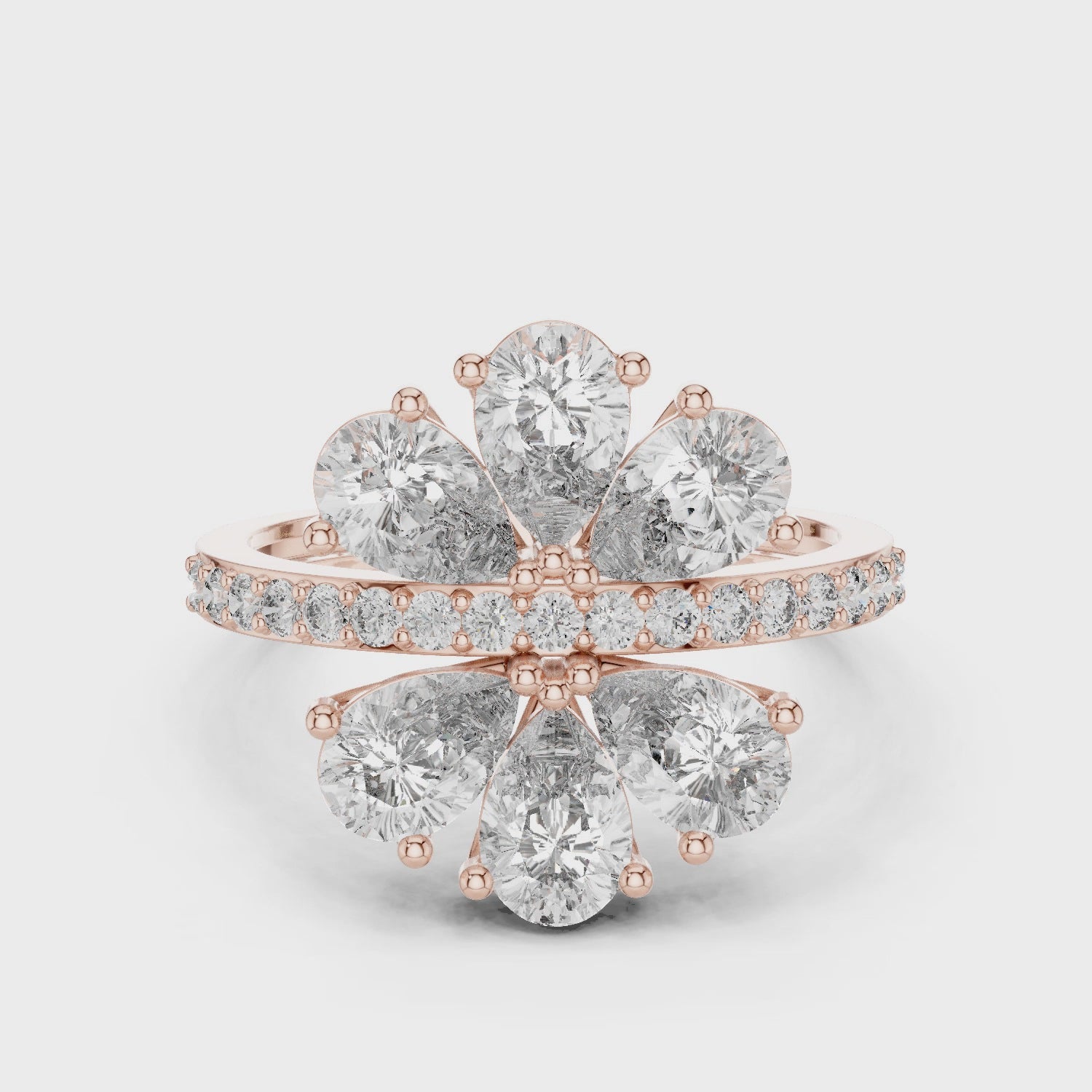 Feminine and fabulous, this rose gold Gleaming Large Flower ring dazzles with 2.5 carats of pear and round lab-grown diamonds. Ideal for modern girls who love floral glam and Instagram-worthy fashion.