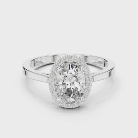 A graceful 1 carat oval-cut solitaire shines bright within a halo of round lab diamonds, elevated by a polished white gold band. Luxe brilliance for modern women who want elegance and edge—ideal for Indian weddings and fashion-forward events.