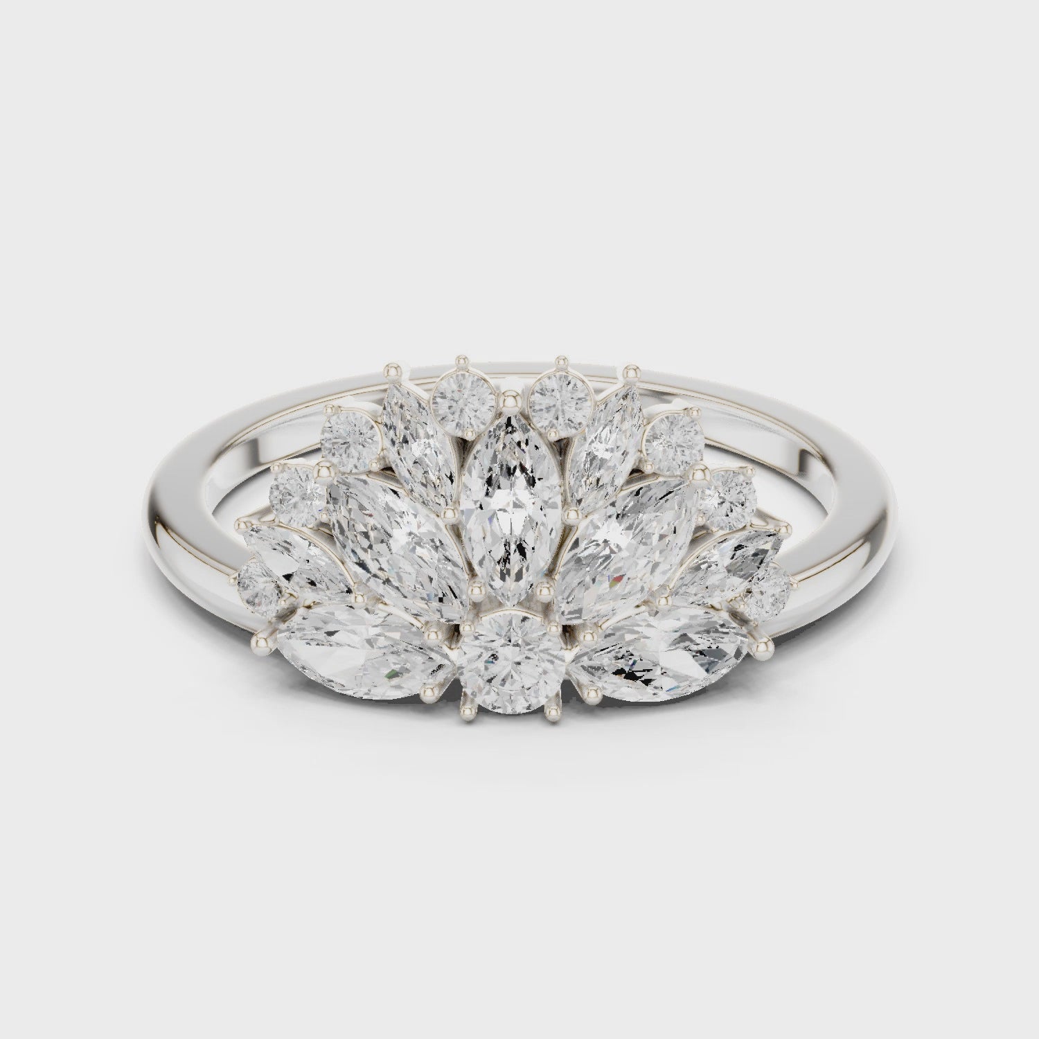 Modern and radiant, the white gold version reimagines the peacock-inspired cluster with clean, minimal elegance. The 9 marquise lab-grown diamonds (0.80 ct) and 9 round stones (0.20 ct) are arranged in a layered feather-like arc that dazzles with every movement. The cool white gold adds a fresh, refined finish—perfect for milestone gifting, engagement alternatives, or bold styling for contemporary women.