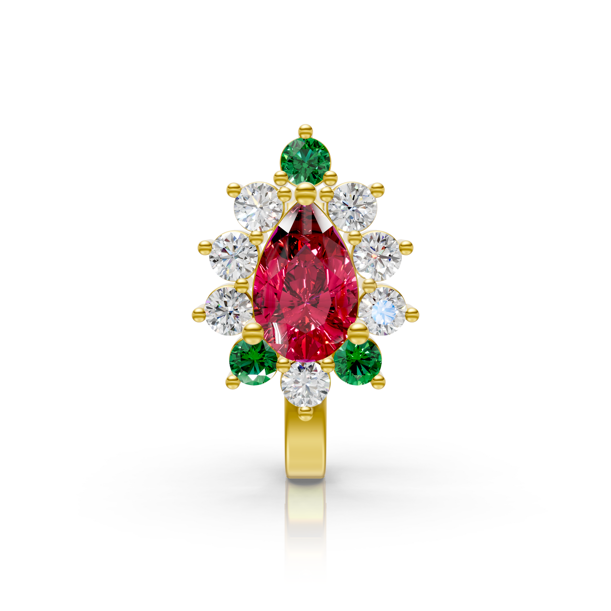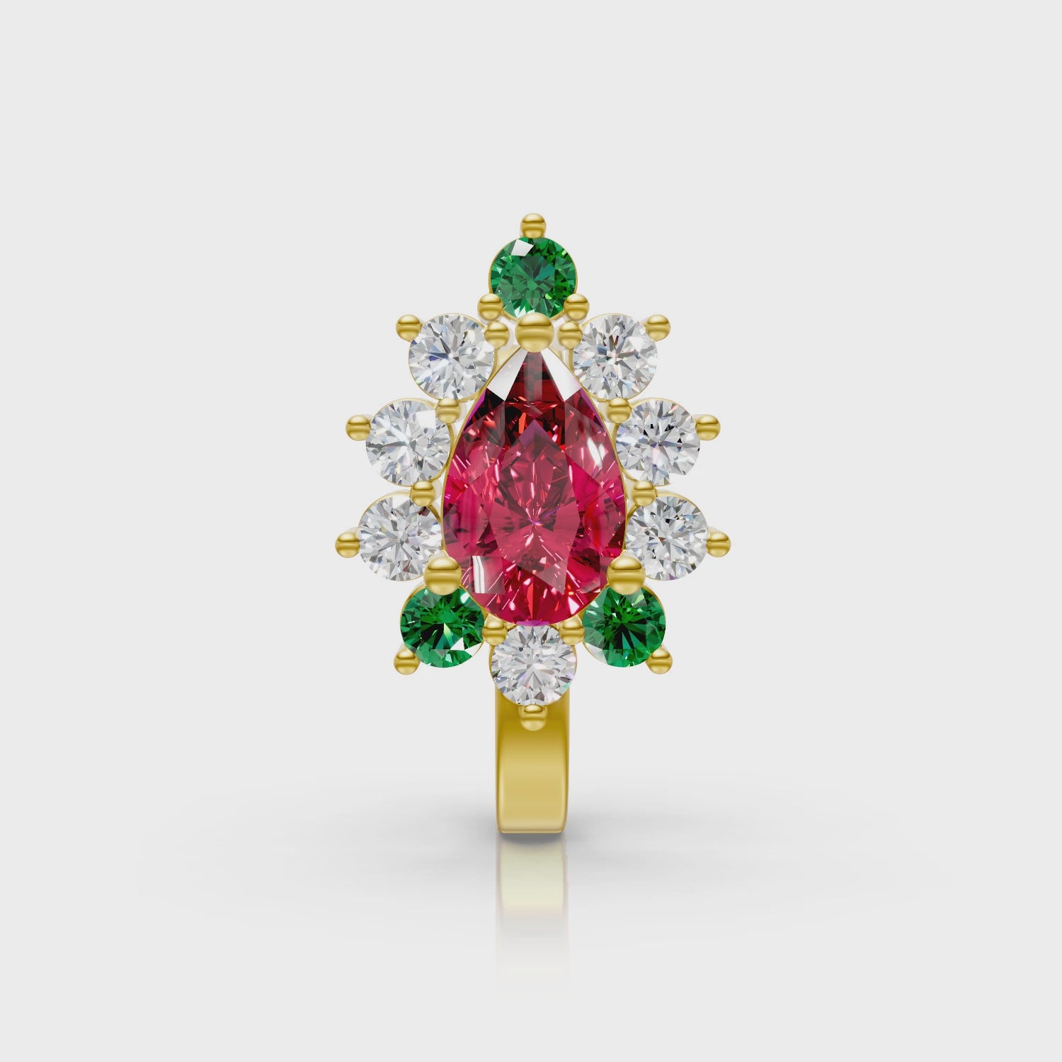 This exquisite nose pin features a striking pear-shaped ruby centerpiece, beautifully set in 14K yellow gold. The vibrant ruby is gracefully framed by 7 sparkling lab-grown diamonds, enhanced with green ruby accents that add depth, contrast, and a unique touch of color to the design.