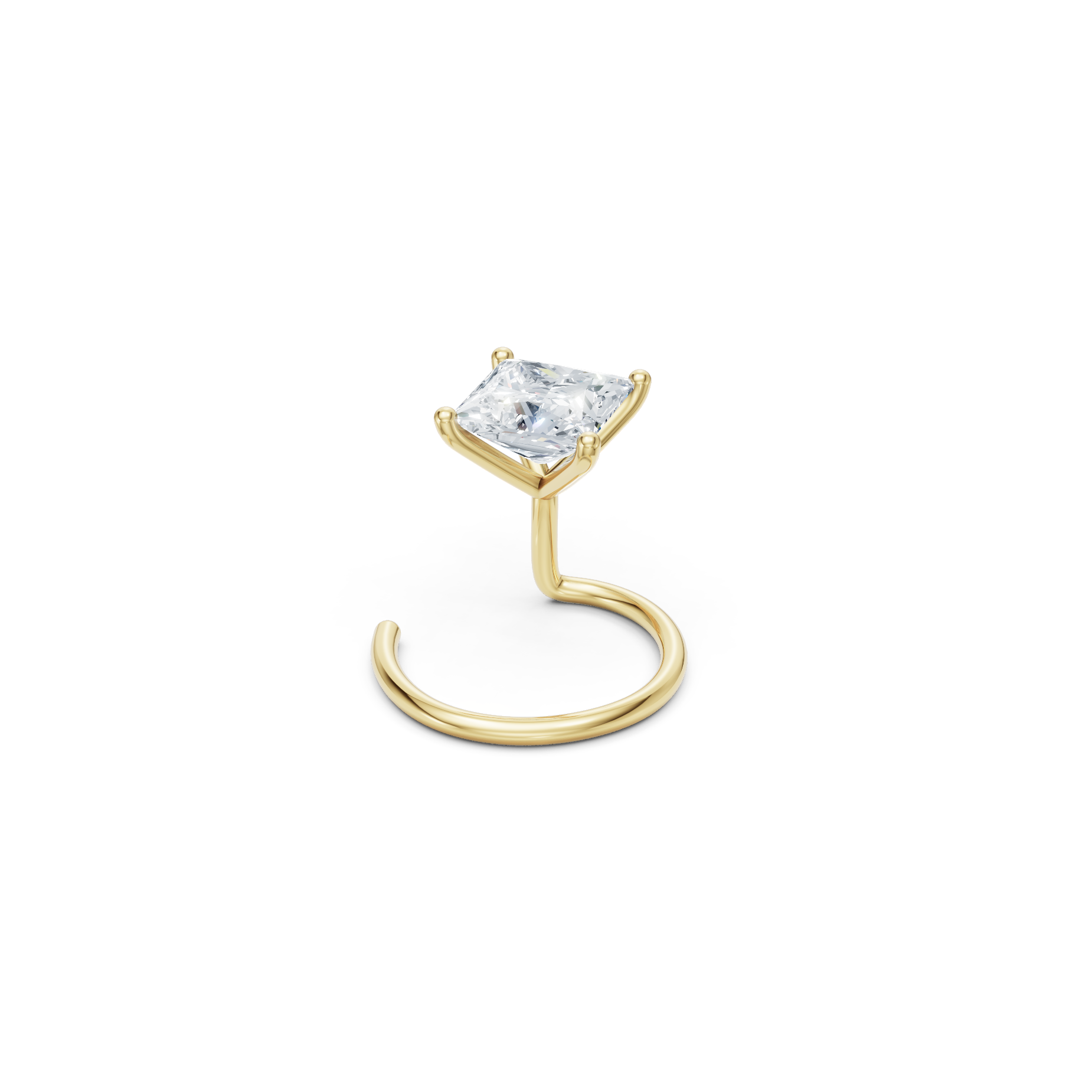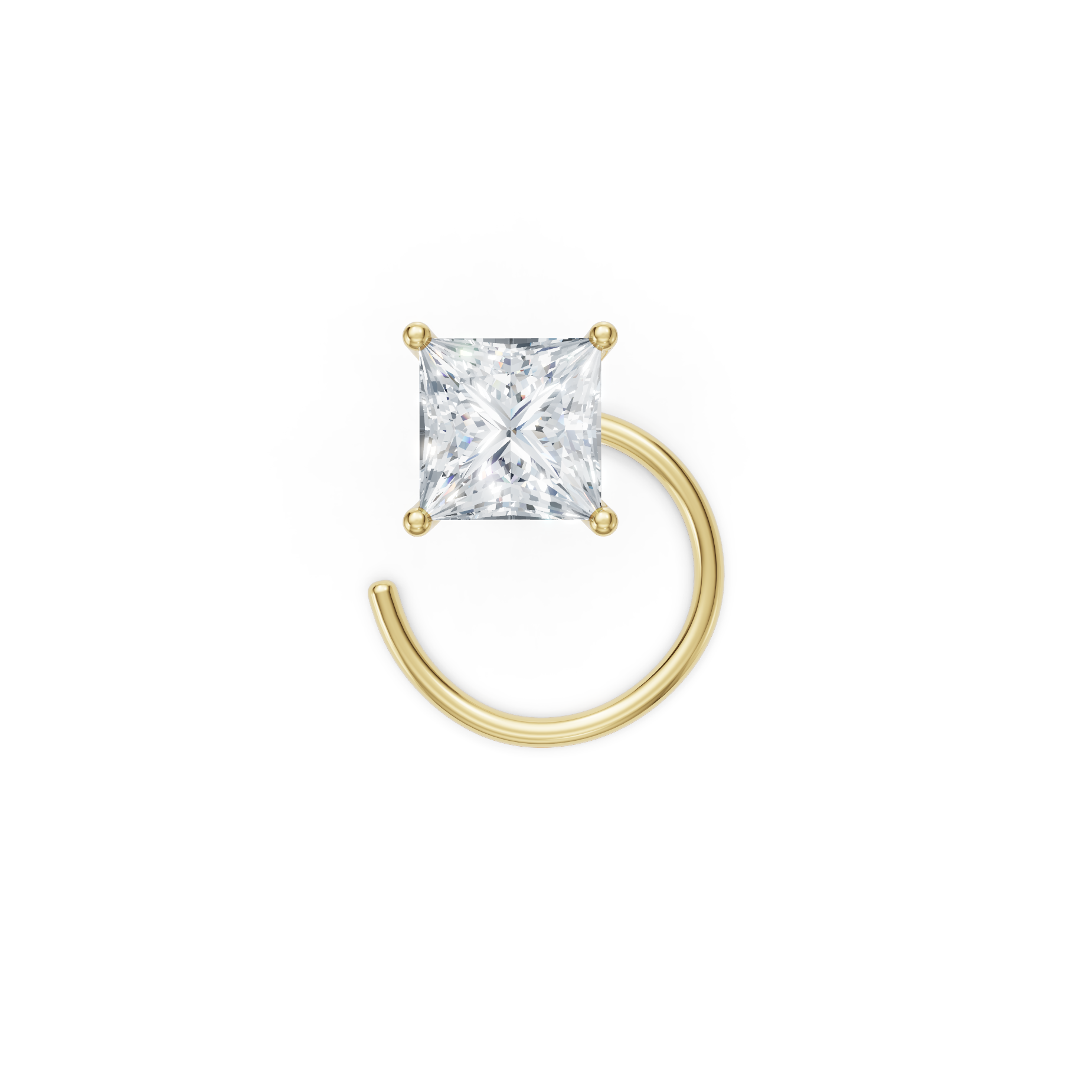 A crisp 0.10 ct princess-cut lab diamond sparkles from a polished yellow-gold nose wire. Four fine prongs reveal every facet, while the open curve slips in smoothly for all-day comfort. A chic nosepin that lifts casual tees, festive kurtas, and everything between.