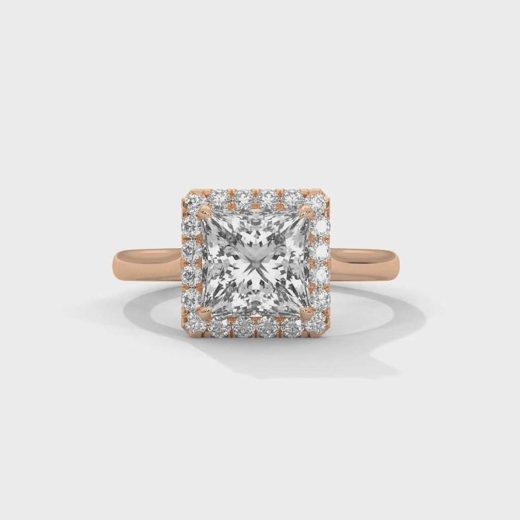 Delicately romantic and effortlessly trendy, this rose gold Regal Princess Cut Lab Grown Diamond Ring features a radiant 2 carat princess-cut center, enhanced with a sparkling pavé of round diamonds. A favorite among Gen Z and millennial brides, this blush-toned beauty is perfect for proposal moments, vow renewals, or luxury gifting with a modern heart.
