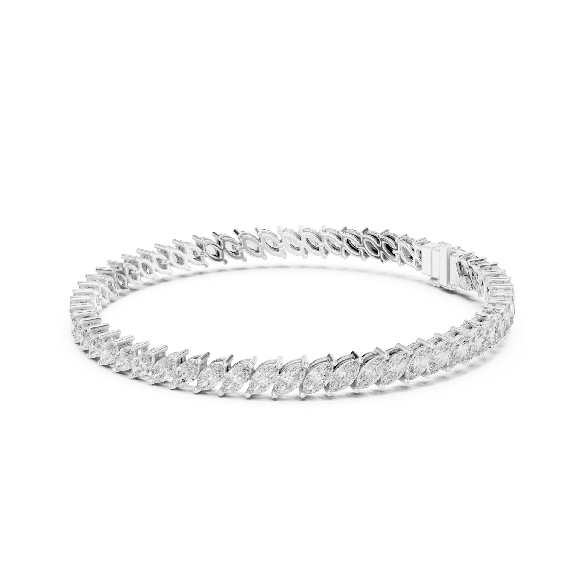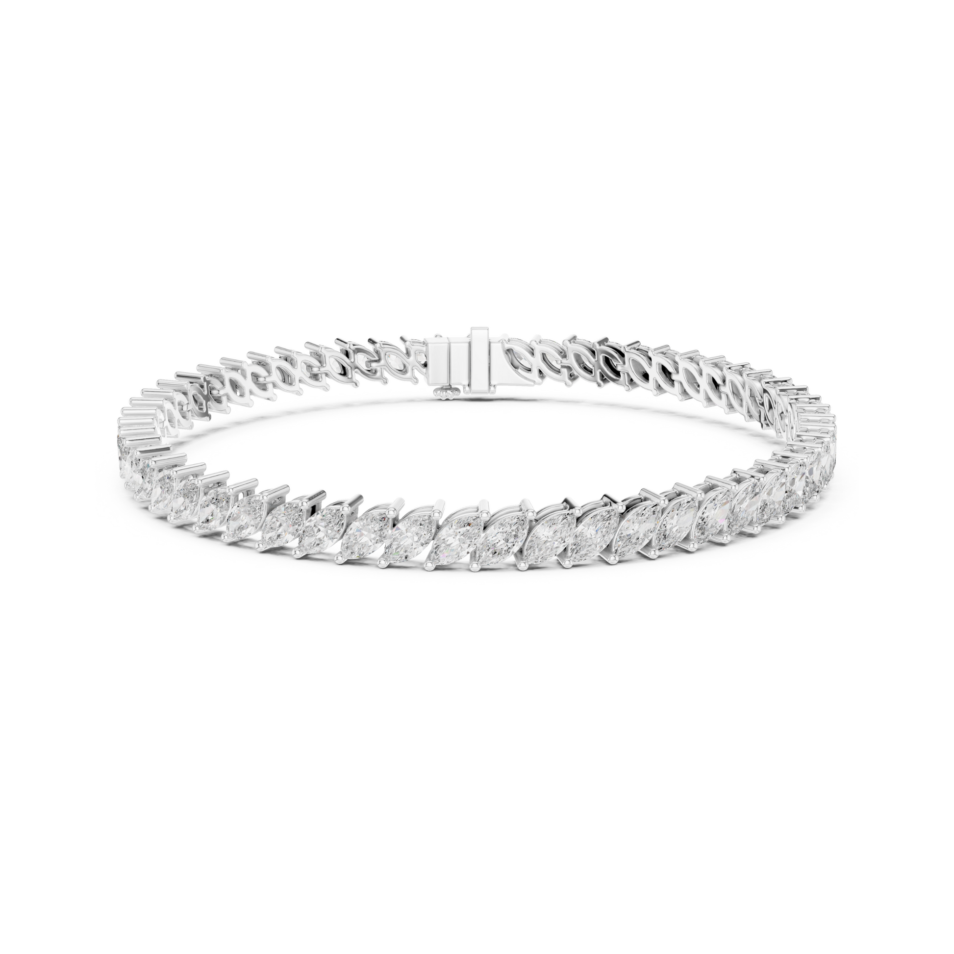 An elegant blend of precision and sparkle, this tennis bracelet showcases 56 marquise-shaped lab diamonds (8.4 ct), set in icy white gold for a crisp, high-shine finish. The V-prong setting keeps each stone elevated and exposed for full brilliance. Its clean and luxurious look makes it a favorite among modern brides and fashion-forward professionals.